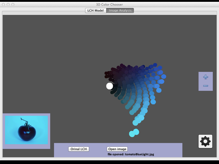 Our app can perform a real-time analysis of any image. Here the pixels of the image of the red tomato are analyzed and the results are compared to the full color model returning a color space, or gamut, for that image.